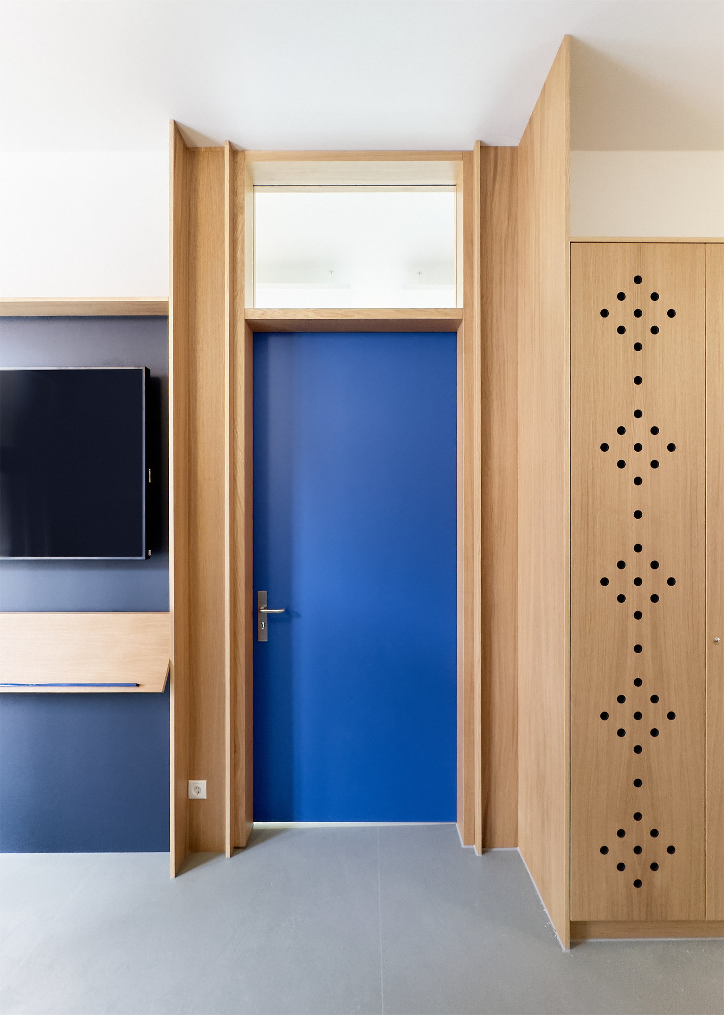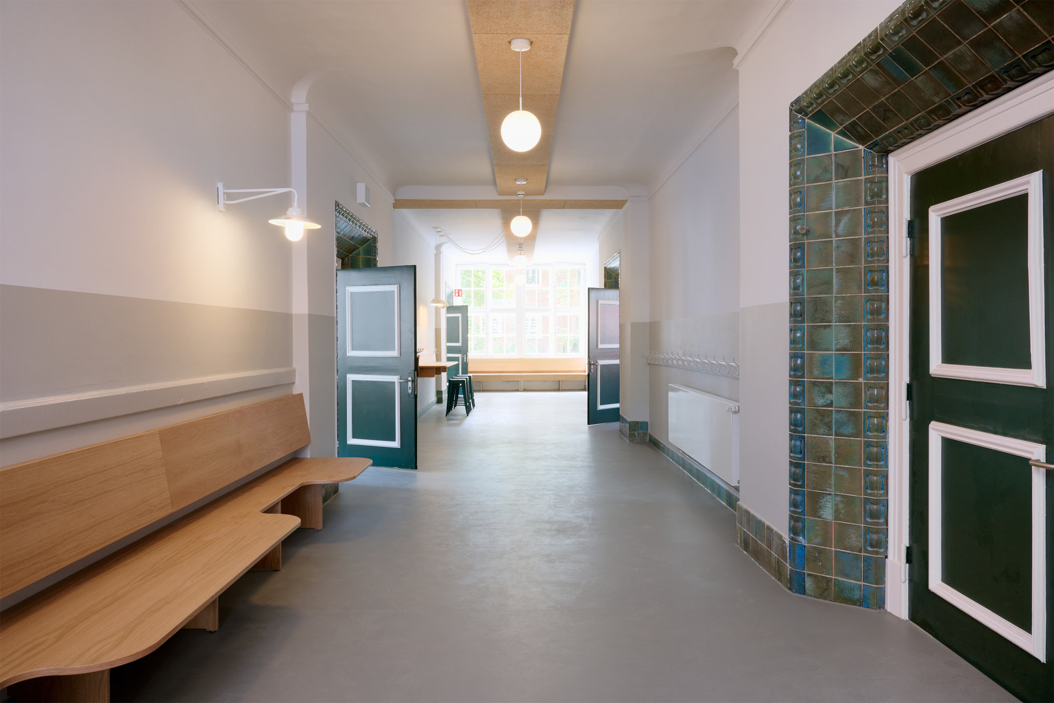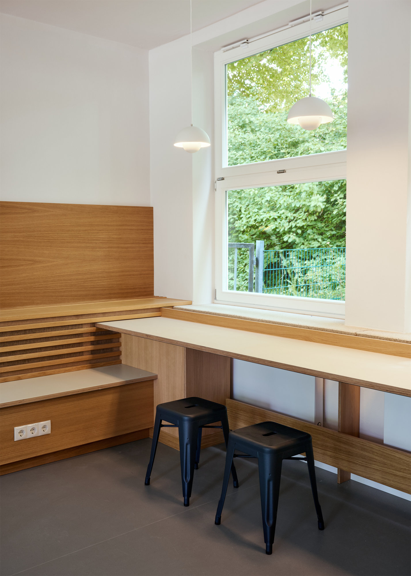 Da das Schulkollegium hier mit außergewöhnlich hohen sozialen Herausforderungen konfrontiert ist, wurden neben Gemeinschafts- und Arbeitsbereichen auch Erholungsräume für die Lehrer:innen geschaffen. Hier erlaubten ansonsten nur schwer nutzbare Raumkonstellationen unterschiedliche Raumszenarien von Kommunikation, über Konzentration bis zum Rückzugsort.