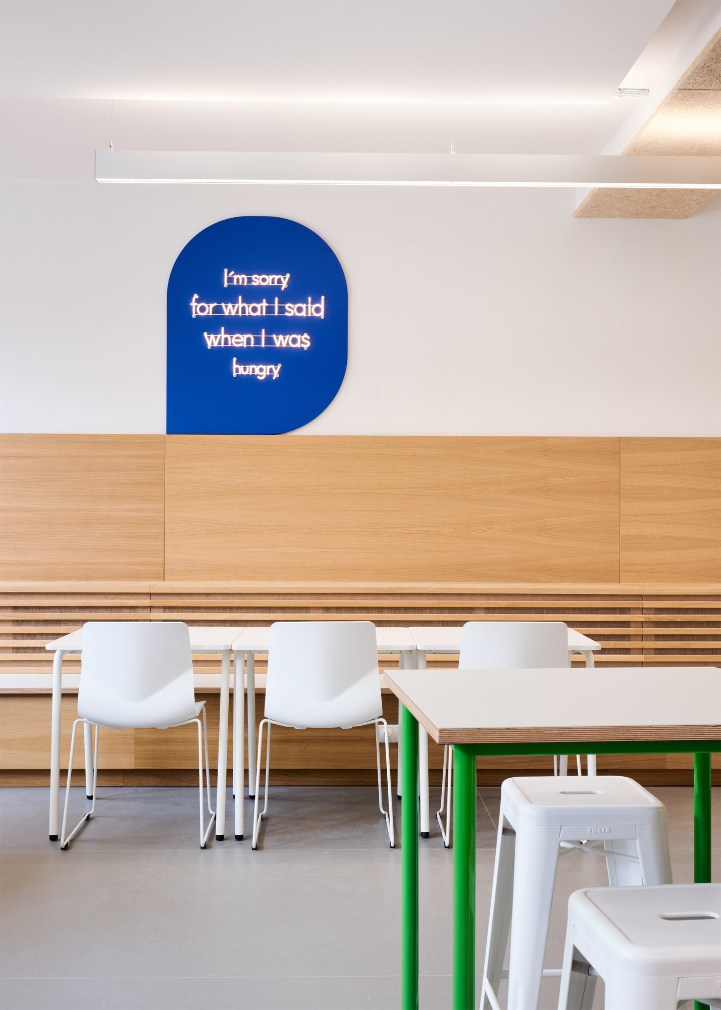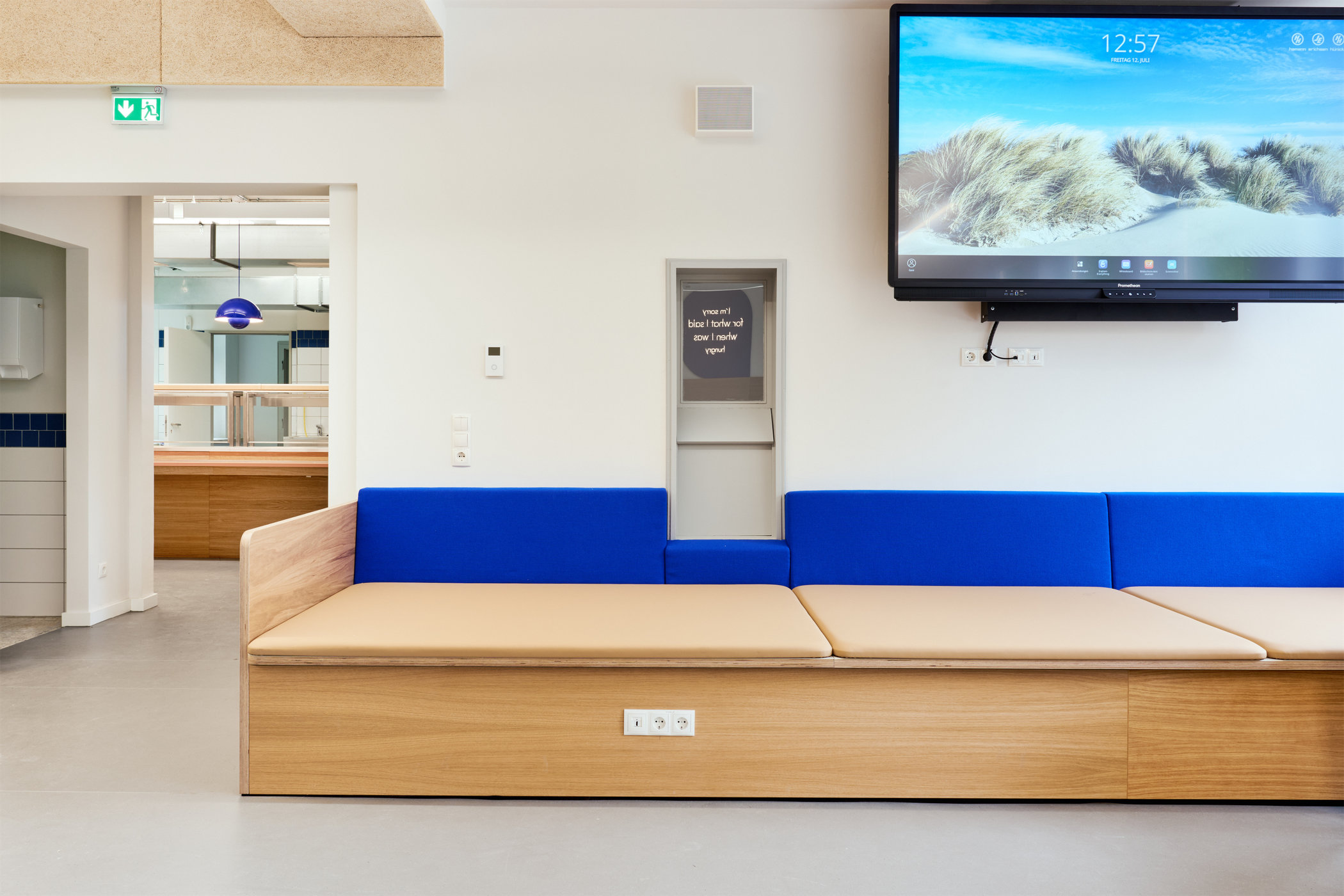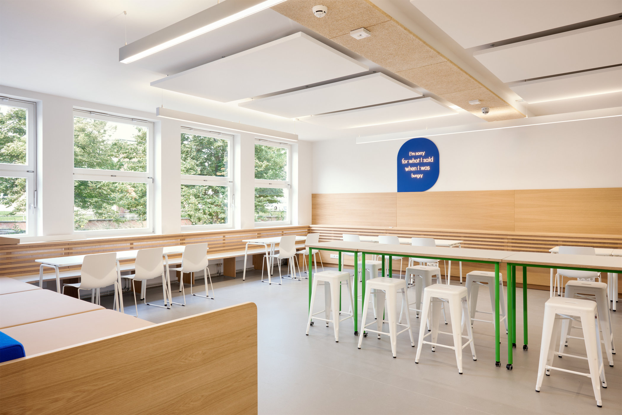 Die Mensa ist multifunktional angelegt und dient neben dem Essen auch dem Arbeiten, als Aufenthaltsbereich und Veranstaltungen wie Elternabenden.
