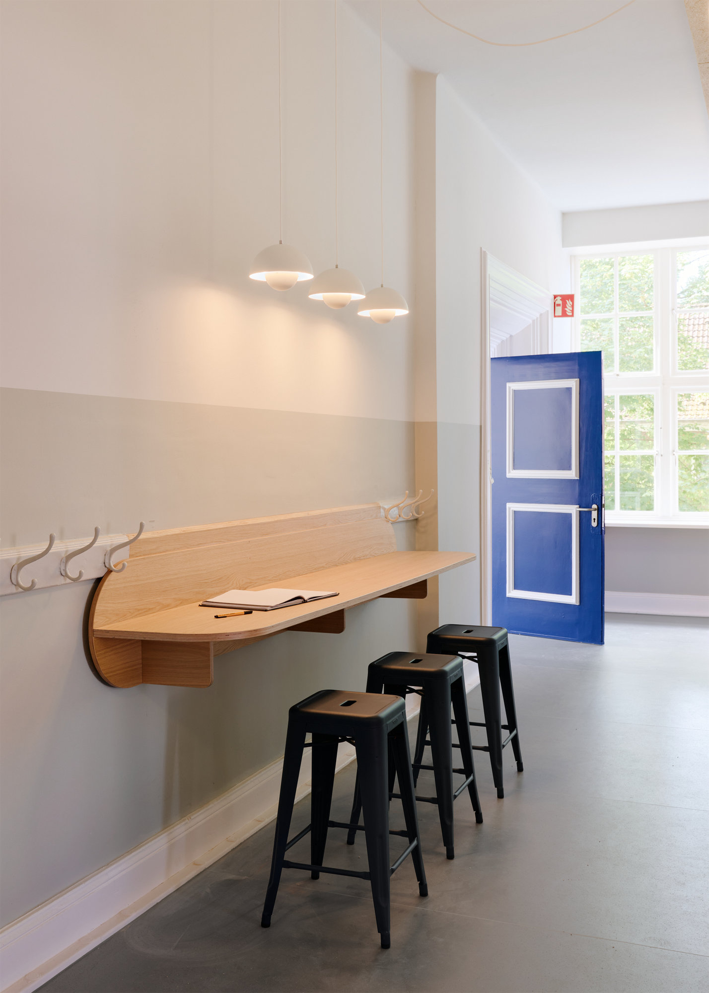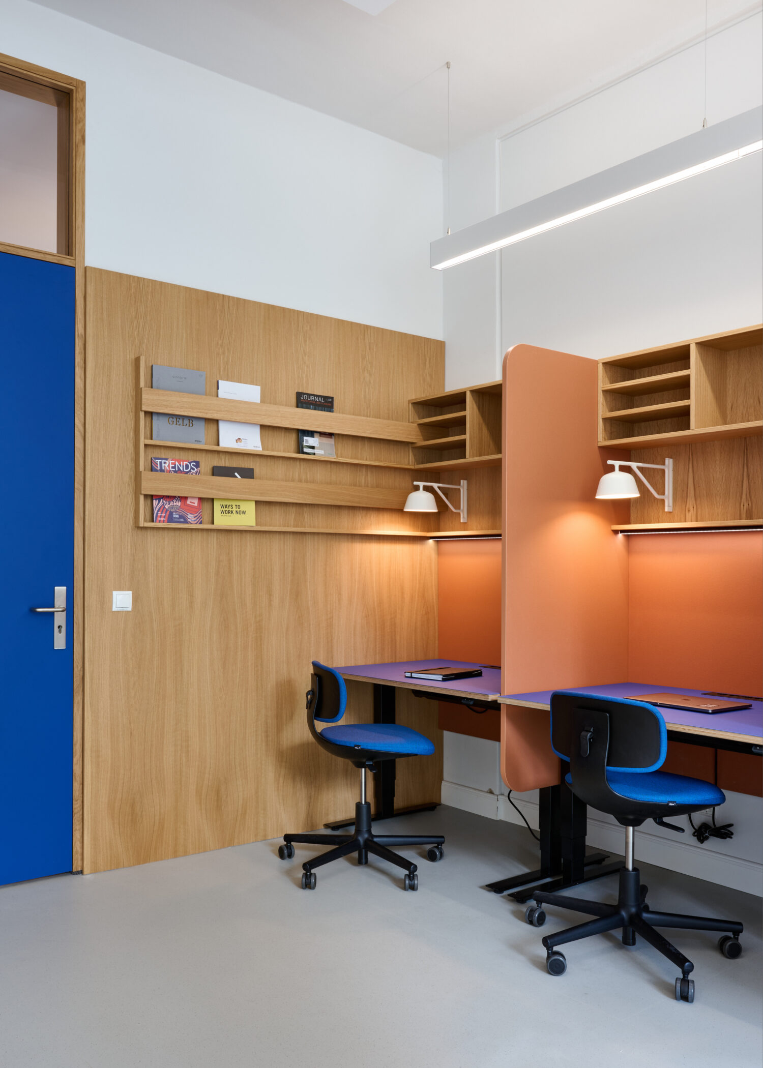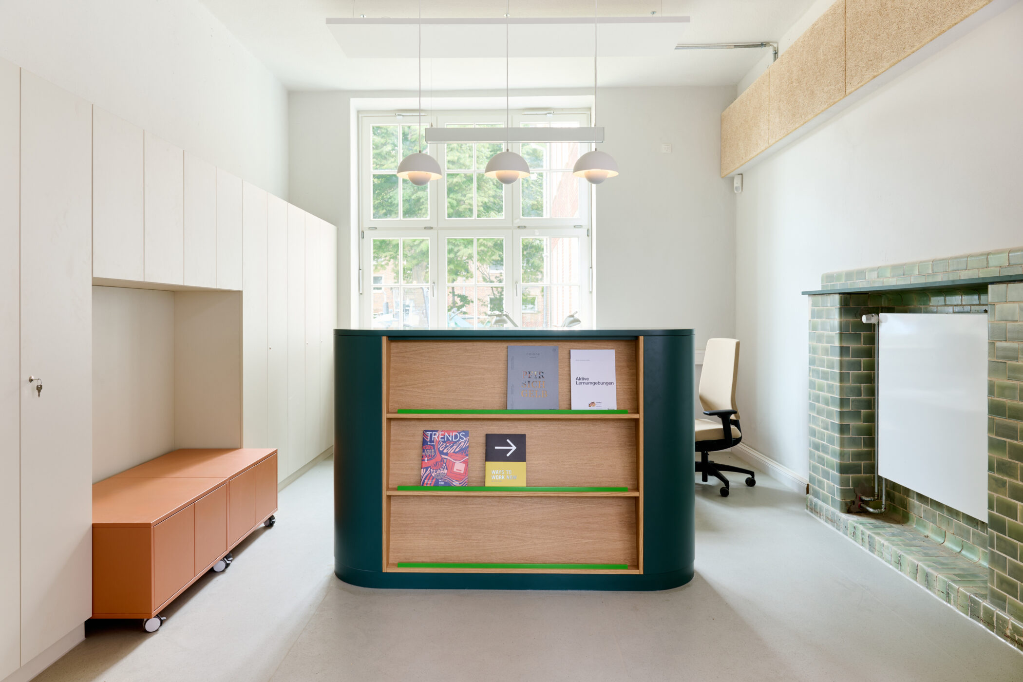 Da nicht genügend Platz zur Verfügung stand, um alle Arbeitsplätze im Lehrer:innenzimmer abzubilden, wurden andere Orte im Gebäude für weitere flexible Arbeitsplätze und Arbeitsräume genutzt.