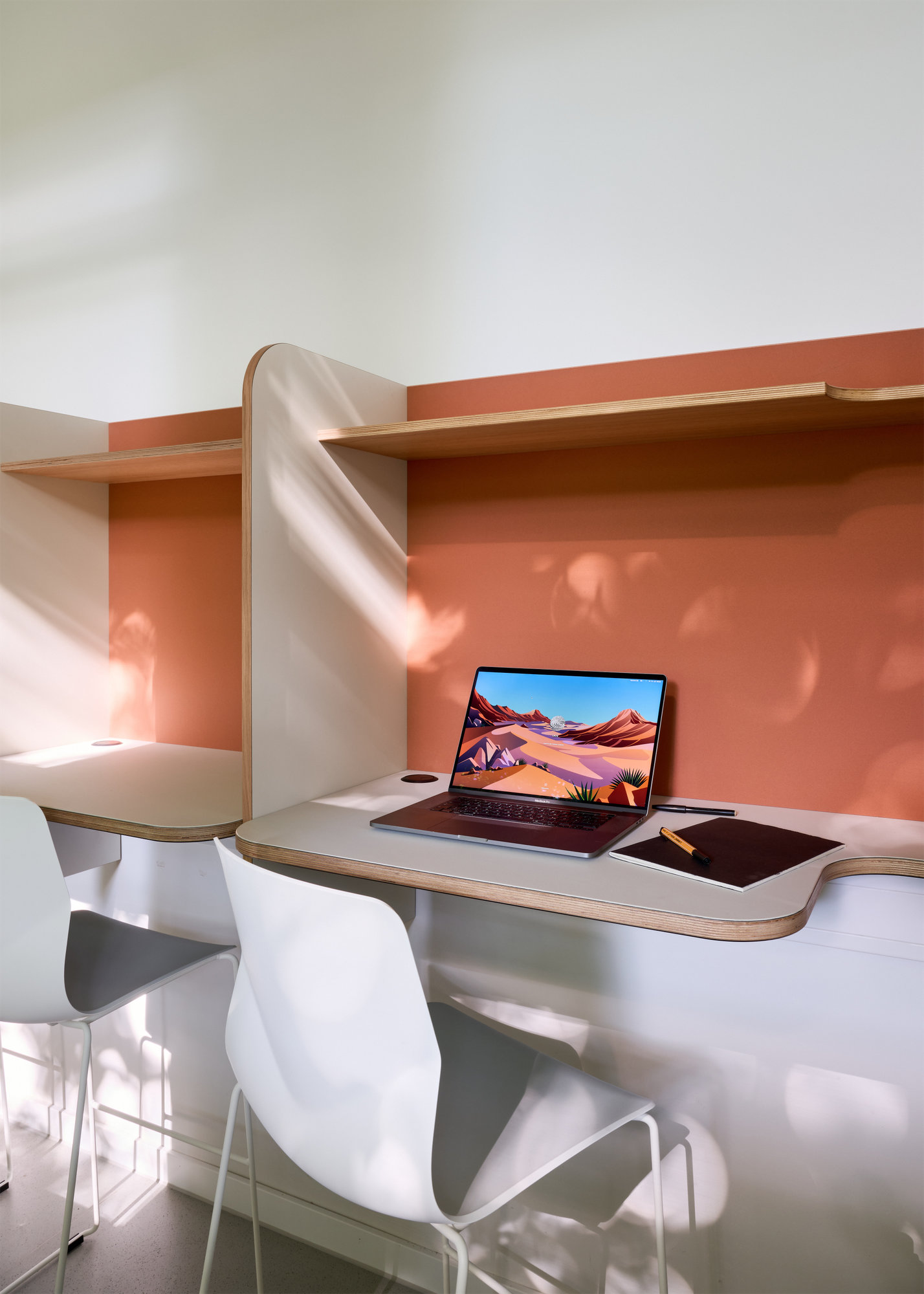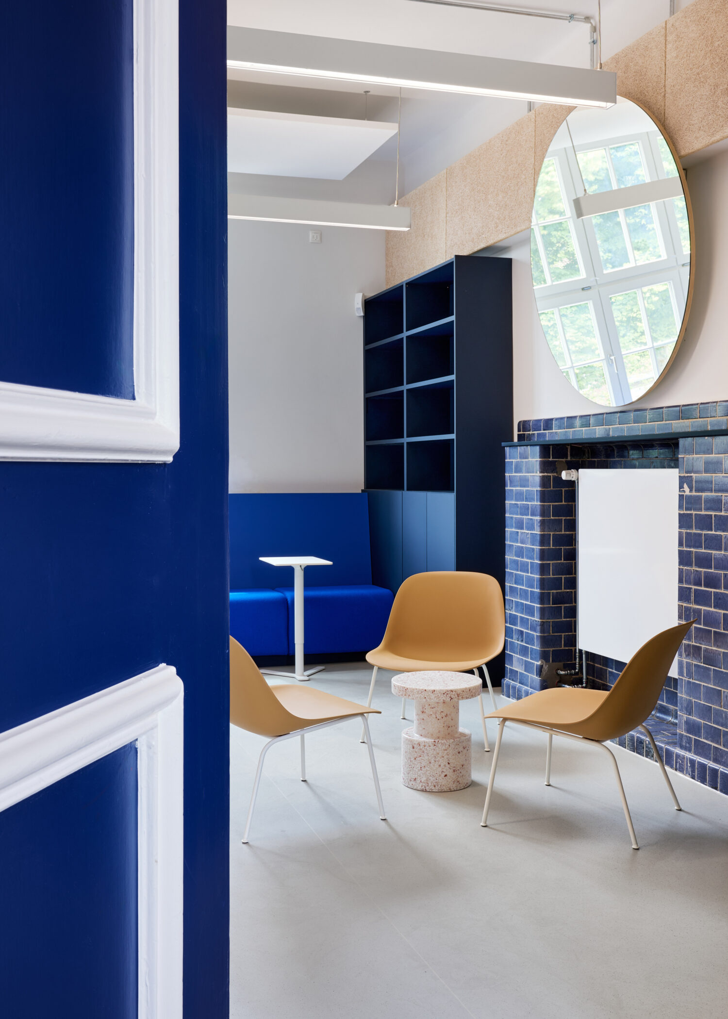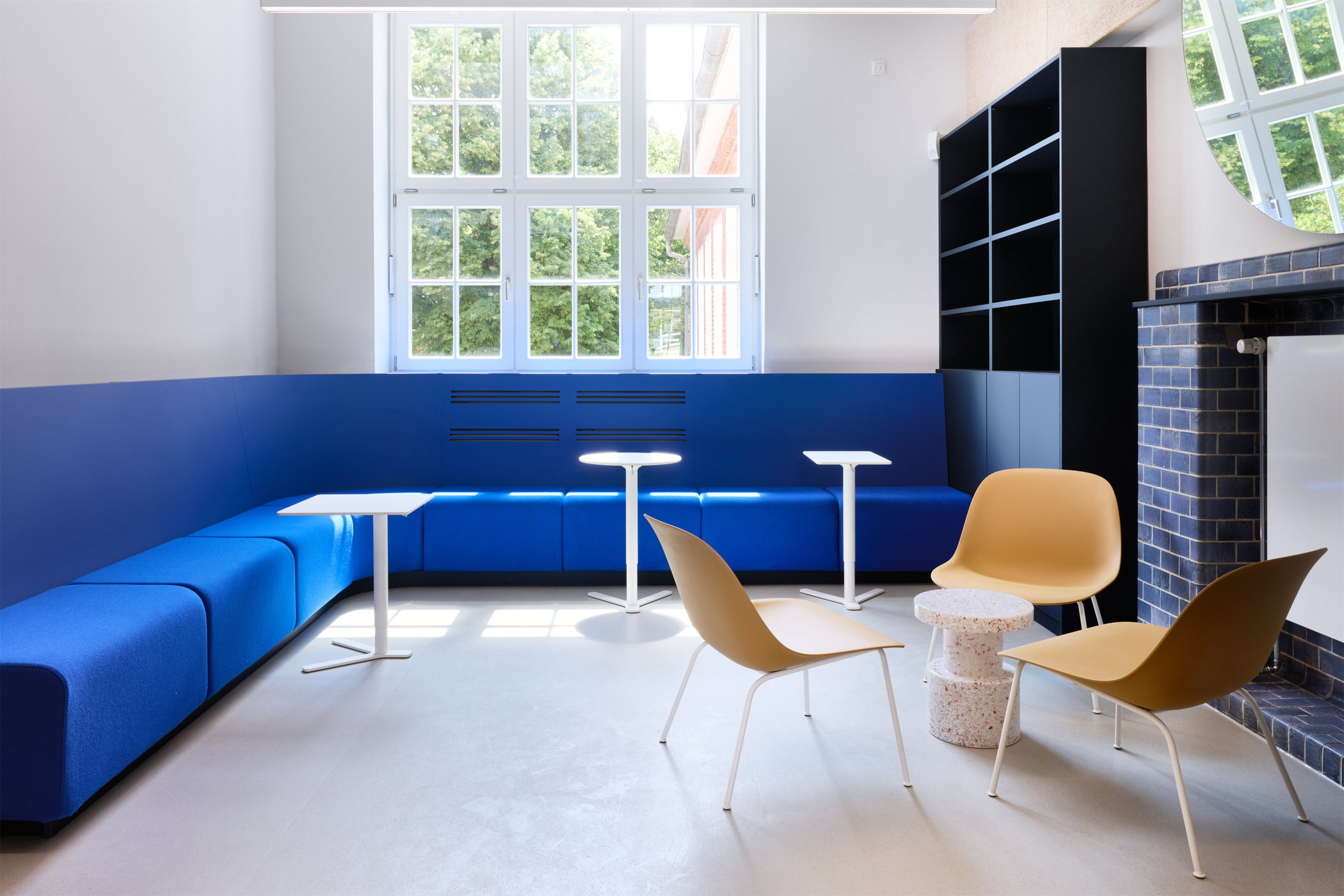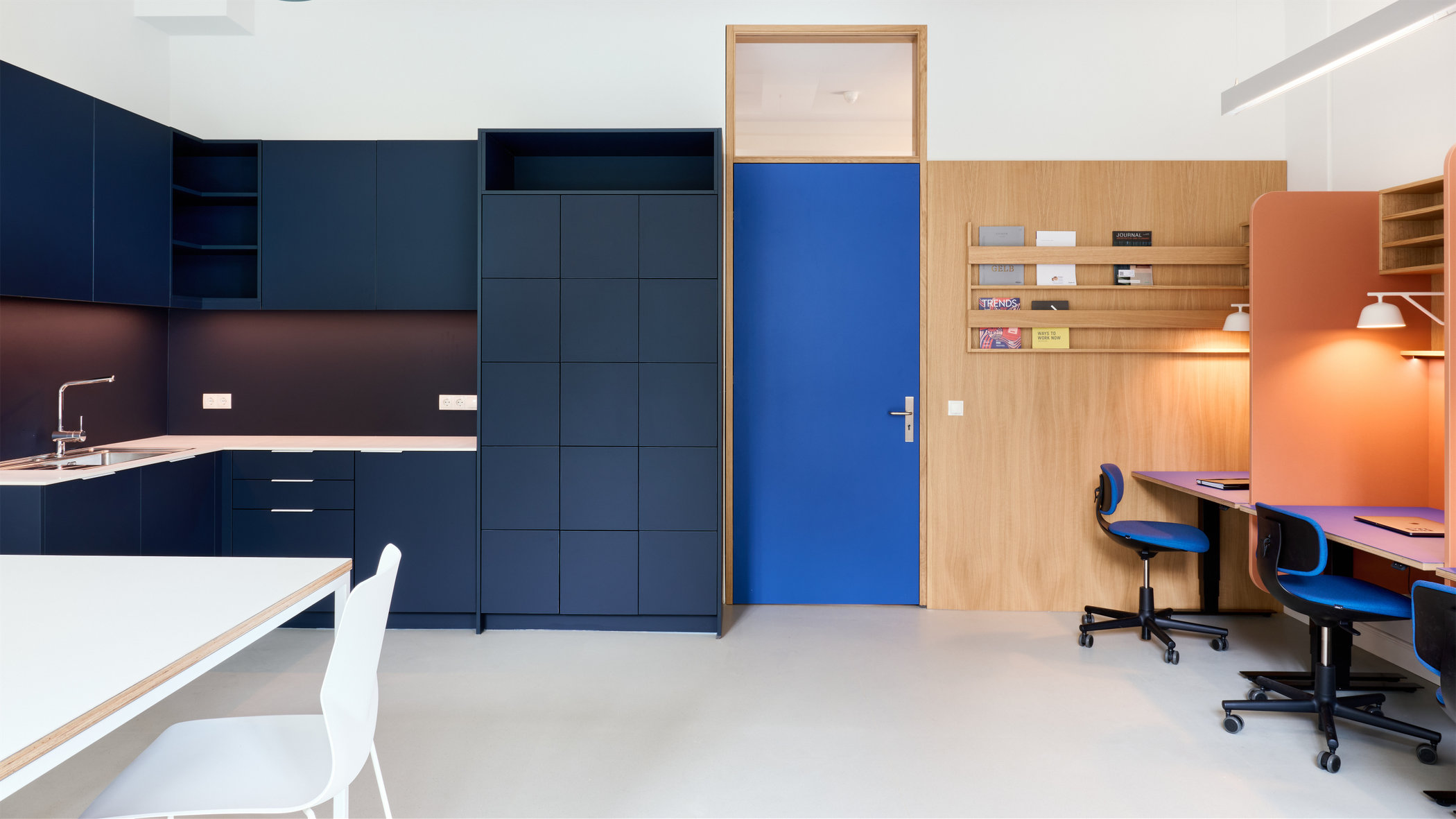 Da nicht genügend Platz zur Verfügung stand, um alle Arbeitsplätze im Lehrer:innenzimmer abzubilden, wurden andere Orte im Gebäude für weitere flexible Arbeitsplätze und Arbeitsräume genutzt.