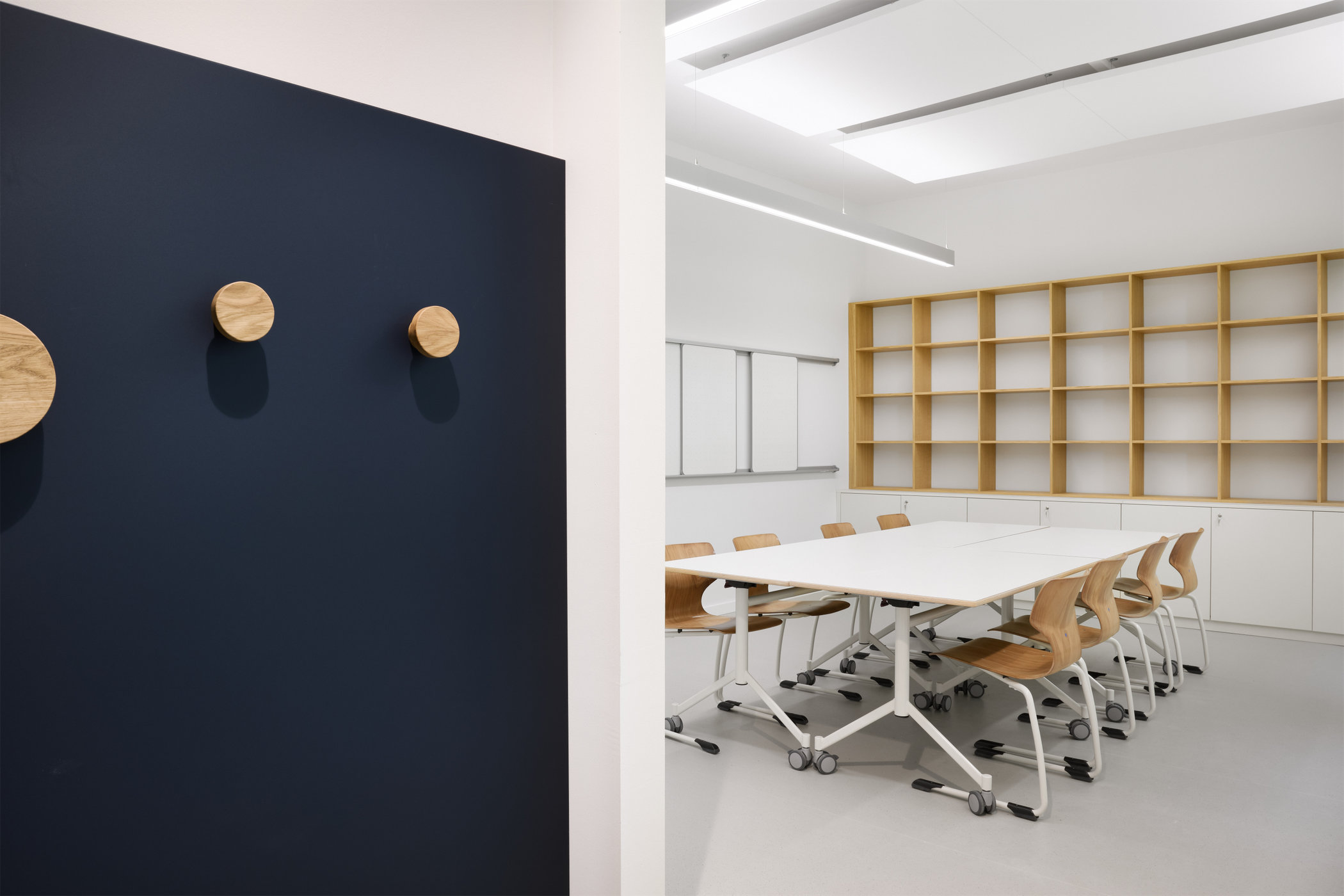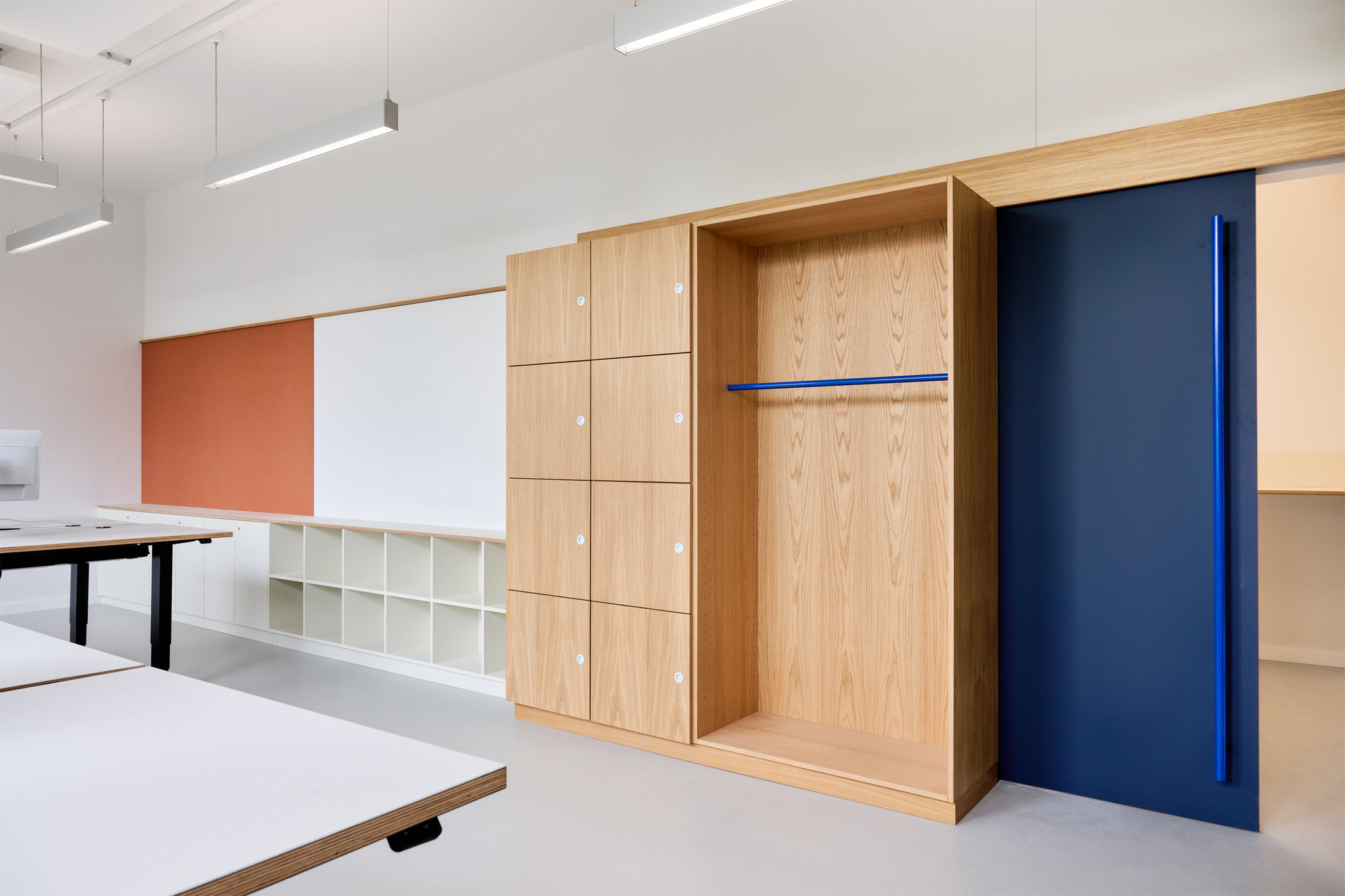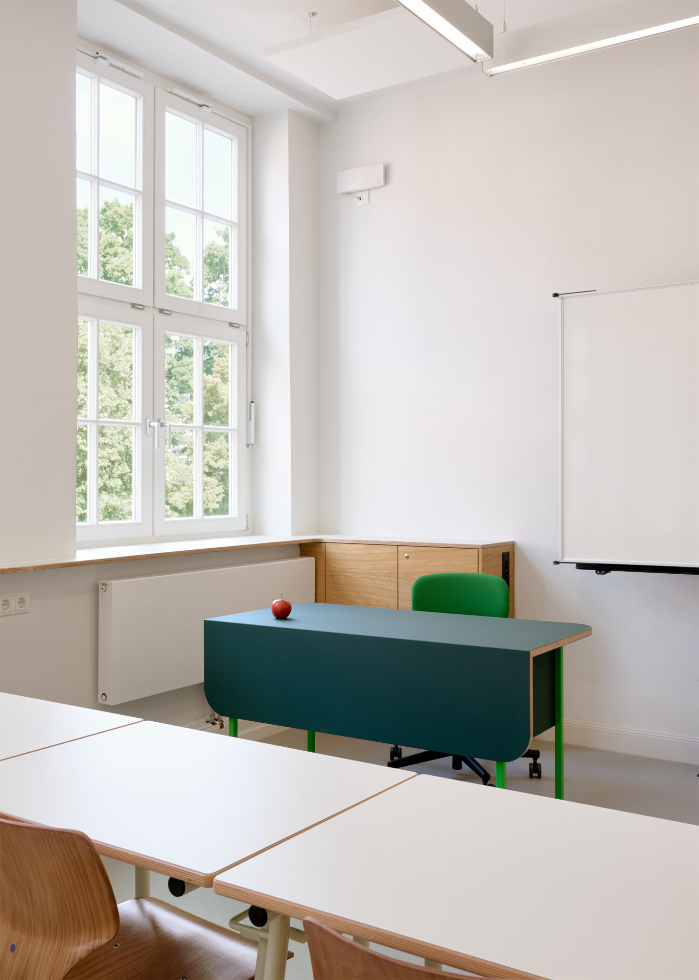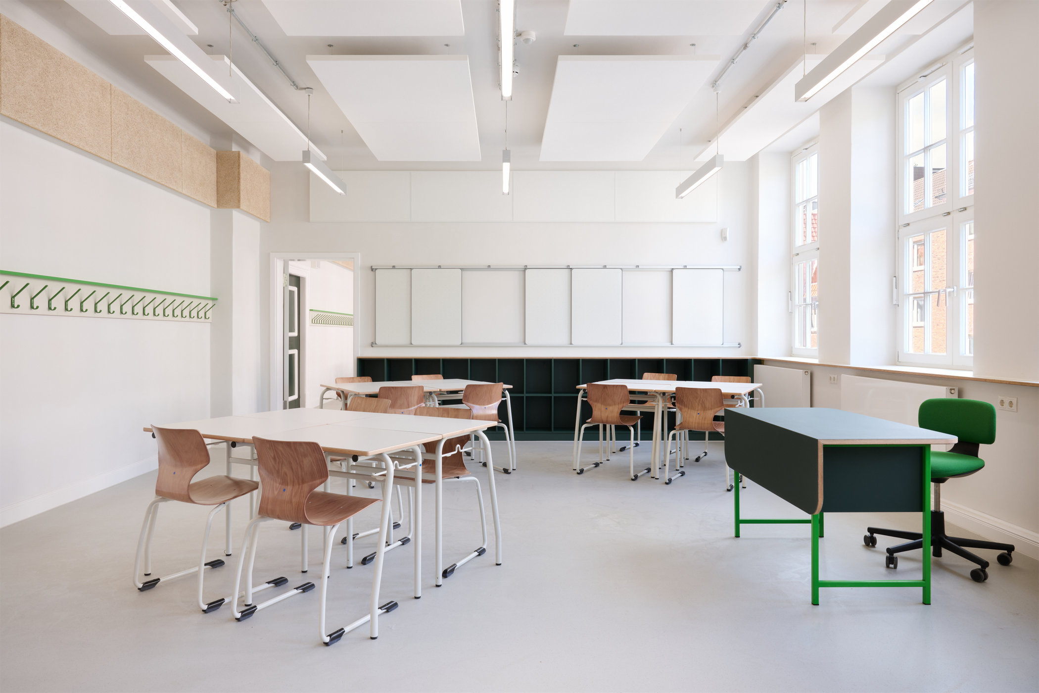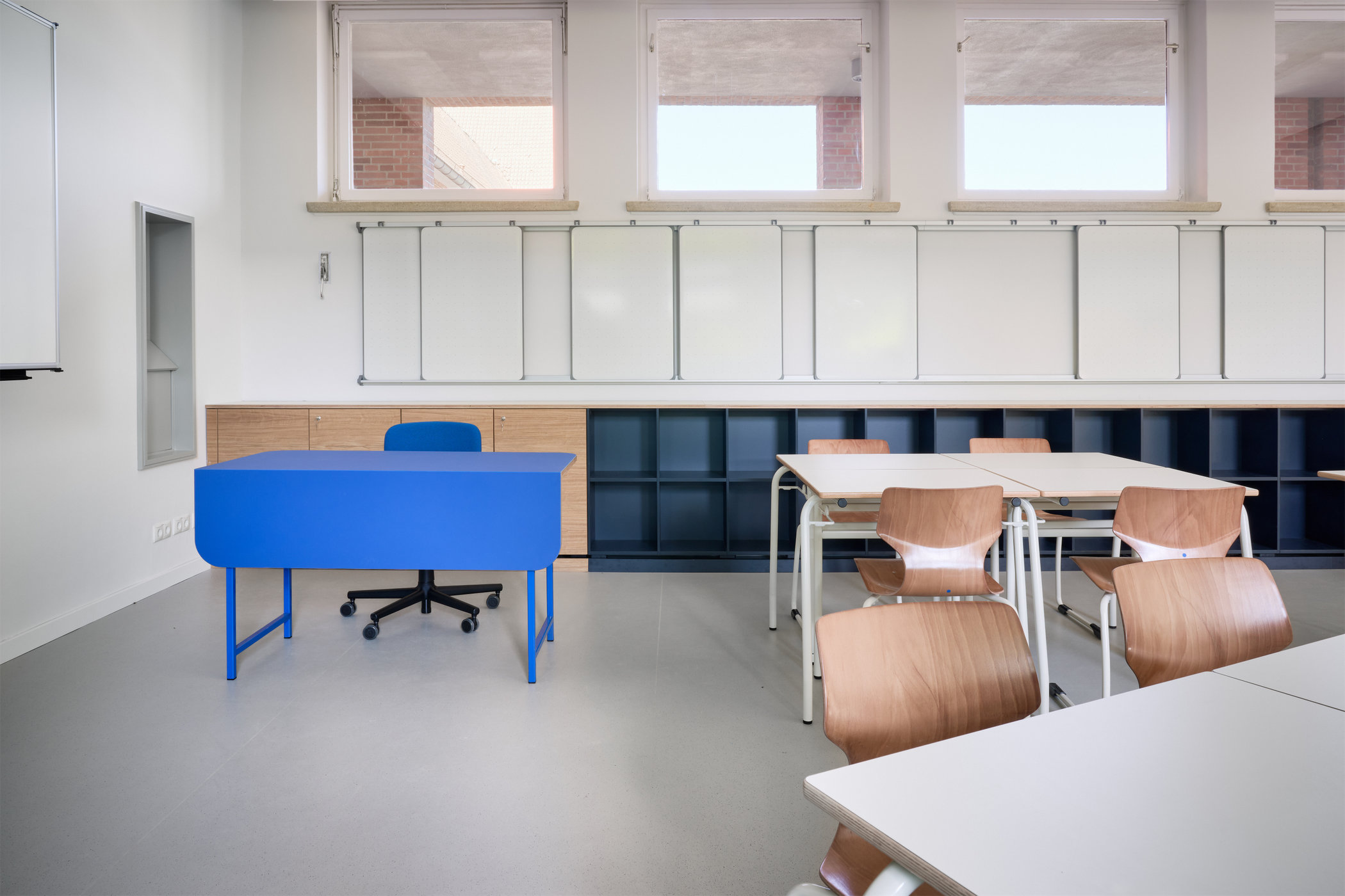 Die Klassenräume wurden mit festen Schrankelementen für Schüler:innen und Lehrer:innen ausgestattet. Tische und Stühle sind leicht verschiebbar, um den Gruppenanforderungen jederzeit spontan gerecht zu werden. Jeder Klassenraum ist mit einem flexiblen Tafelsystem ausgestattet, das den Kindern ermöglicht, ihre Arbeitsergebnisse einfach darzustellen und zu präsentieren.